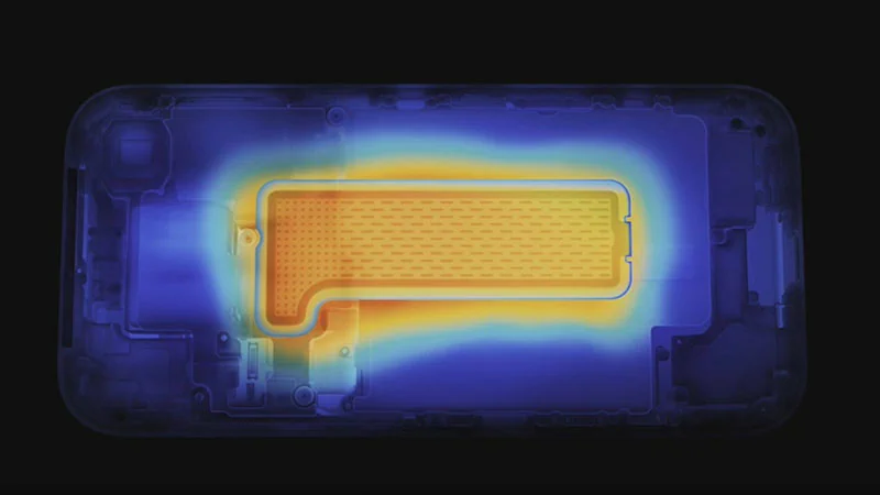 اپل برای بهبود عملکرد طولانیمدت از سیستم خنک کننده بخار (Vapor Chamber) بهره گرفته است که گرما را به شکل یکنواخت در بدنه پخش میکند و از افت عملکرد در استفادههای سنگین جلوگیری مینماید. نتیجه این طراحی افزایش پایداری عملکرد تا 40 درصد نسبت به آیفون 16 پرو مکس است.